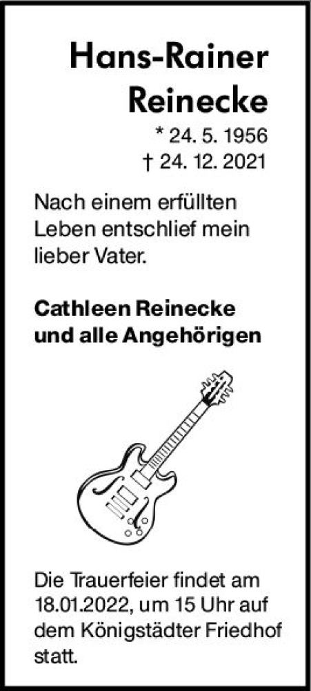 Hier finden Sie alle Traueranzeigen aus der Zeitung, die bisher für Hans-Rainer Reinecke erschienen sind. Weitere Traueranzeigen, die in der Zeitung erscheinen, werden hier ebenfalls aufgelistet