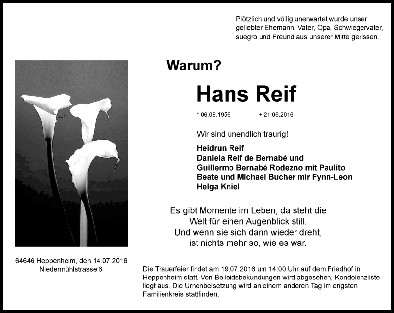 Hier finden Sie alle Traueranzeigen aus der Zeitung, die bisher für Hans Reif erschienen sind. Weitere Traueranzeigen, die in der Zeitung erscheinen, werden hier ebenfalls aufgelistet