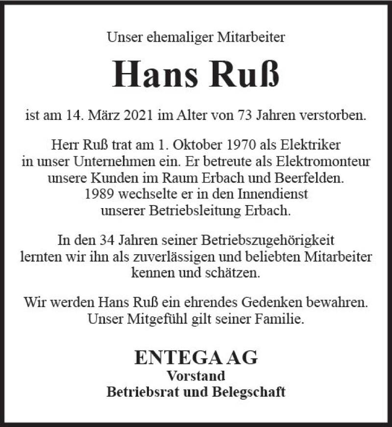 Hier finden Sie alle Traueranzeigen aus der Zeitung, die bisher für Hans Ruß erschienen sind. Weitere Traueranzeigen, die in der Zeitung erscheinen, werden hier ebenfalls aufgelistet