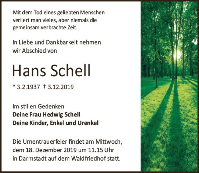 Hier finden Sie alle Traueranzeigen aus der Zeitung, die bisher für Hans Schell erschienen sind. Weitere Traueranzeigen, die in der Zeitung erscheinen, werden hier ebenfalls aufgelistet