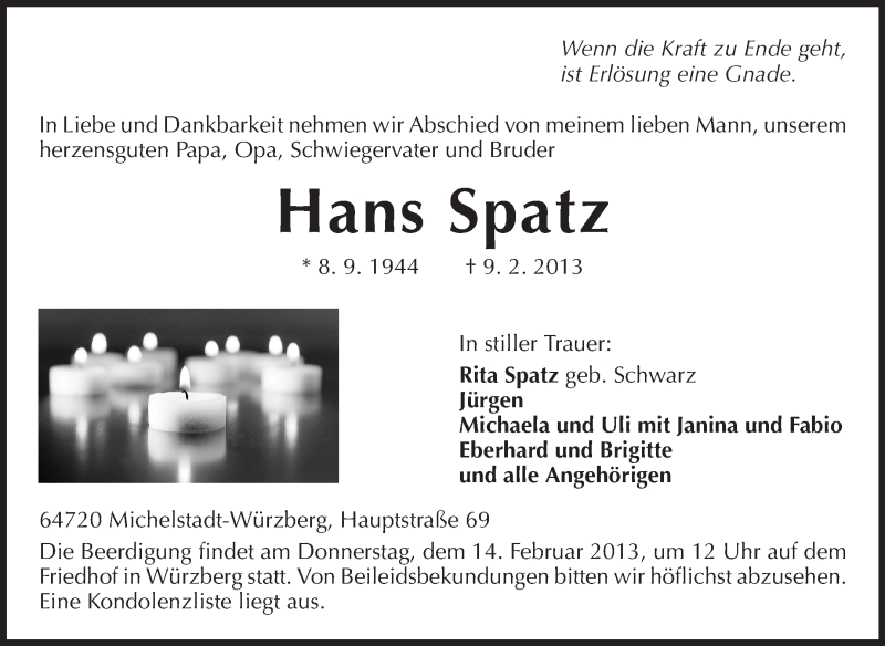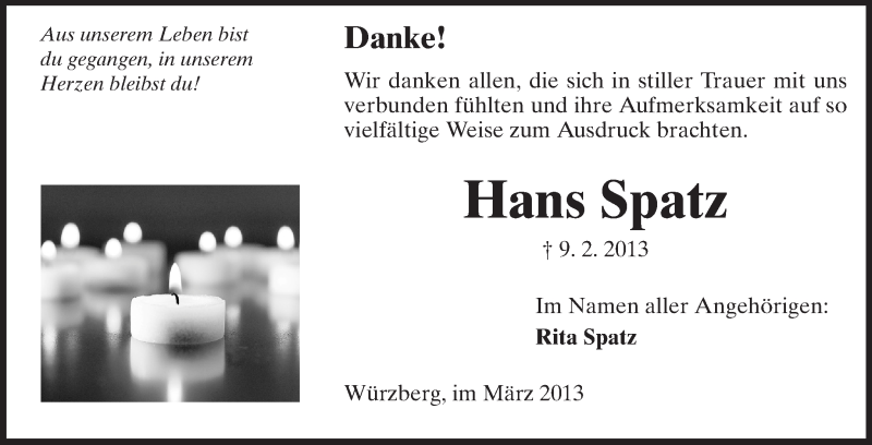 Hier finden Sie alle Traueranzeigen aus der Zeitung, die bisher für Hans Spatz erschienen sind. Weitere Traueranzeigen, die in der Zeitung erscheinen, werden hier ebenfalls aufgelistet