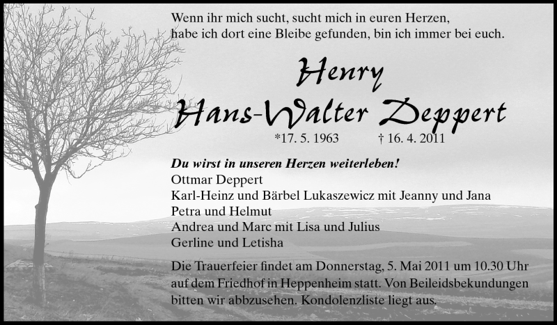 Hier finden Sie alle Traueranzeigen aus der Zeitung, die bisher für Hans-Walter Deppert erschienen sind. Weitere Traueranzeigen, die in der Zeitung erscheinen, werden hier ebenfalls aufgelistet