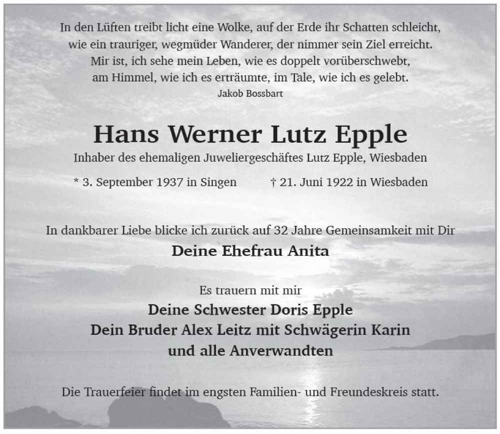 Hier finden Sie alle Traueranzeigen aus der Zeitung, die bisher für Hans Werner Lutz Epple erschienen sind. Weitere Traueranzeigen, die in der Zeitung erscheinen, werden hier ebenfalls aufgelistet