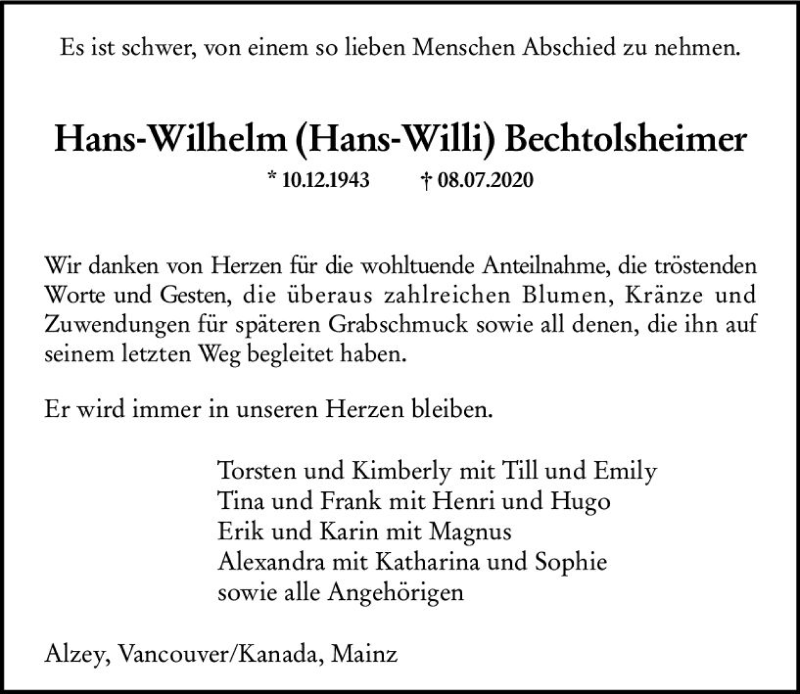 Hier finden Sie alle Traueranzeigen aus der Zeitung, die bisher für Hans-Wilhelm Bechtolsheimer erschienen sind. Weitere Traueranzeigen, die in der Zeitung erscheinen, werden hier ebenfalls aufgelistet