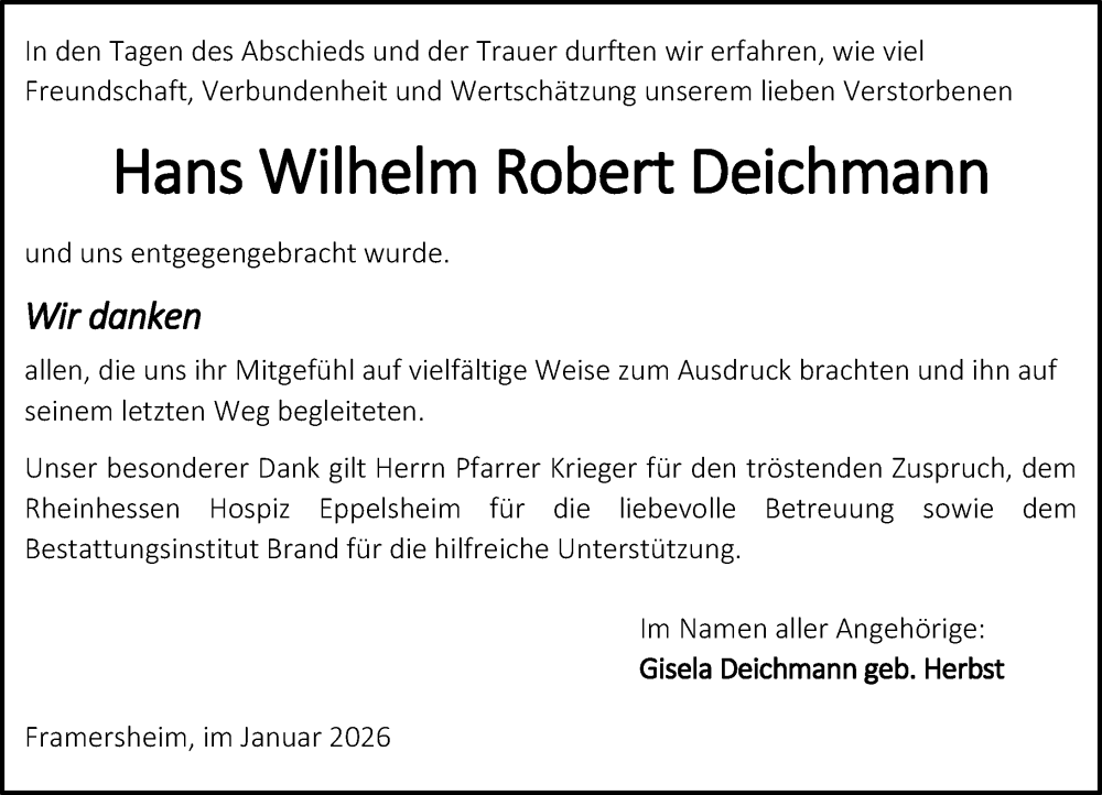 Hier finden Sie alle Traueranzeigen aus der Zeitung, die bisher für Hans Wilhelm Robert Deichmann erschienen sind. Weitere Traueranzeigen, die in der Zeitung erscheinen, werden hier ebenfalls aufgelistet