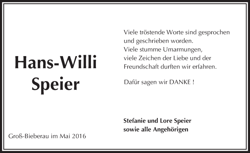 Hier finden Sie alle Traueranzeigen aus der Zeitung, die bisher für Hans-Willi Speier erschienen sind. Weitere Traueranzeigen, die in der Zeitung erscheinen, werden hier ebenfalls aufgelistet