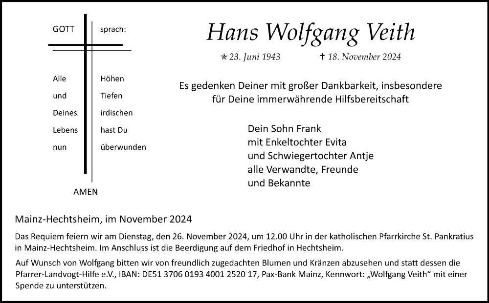 Hier finden Sie alle Traueranzeigen aus der Zeitung, die bisher für Hans Wolfgang Veith erschienen sind. Weitere Traueranzeigen, die in der Zeitung erscheinen, werden hier ebenfalls aufgelistet