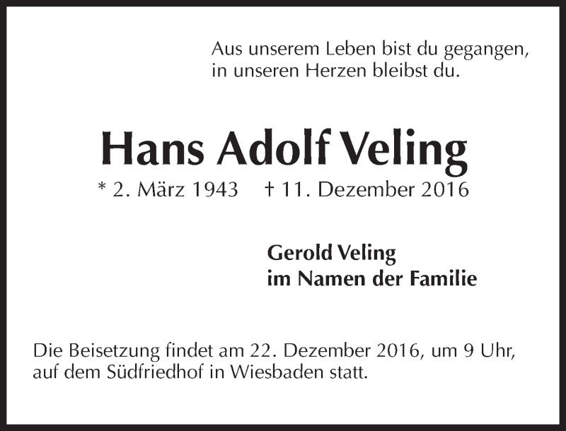 Hier finden Sie alle Traueranzeigen aus der Zeitung, die bisher für Hans Adolf Veling erschienen sind. Weitere Traueranzeigen, die in der Zeitung erscheinen, werden hier ebenfalls aufgelistet