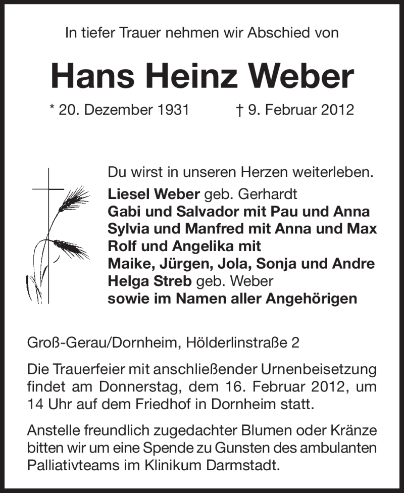 Hier finden Sie alle Traueranzeigen aus der Zeitung, die bisher für Hans Heinz Weber erschienen sind. Weitere Traueranzeigen, die in der Zeitung erscheinen, werden hier ebenfalls aufgelistet