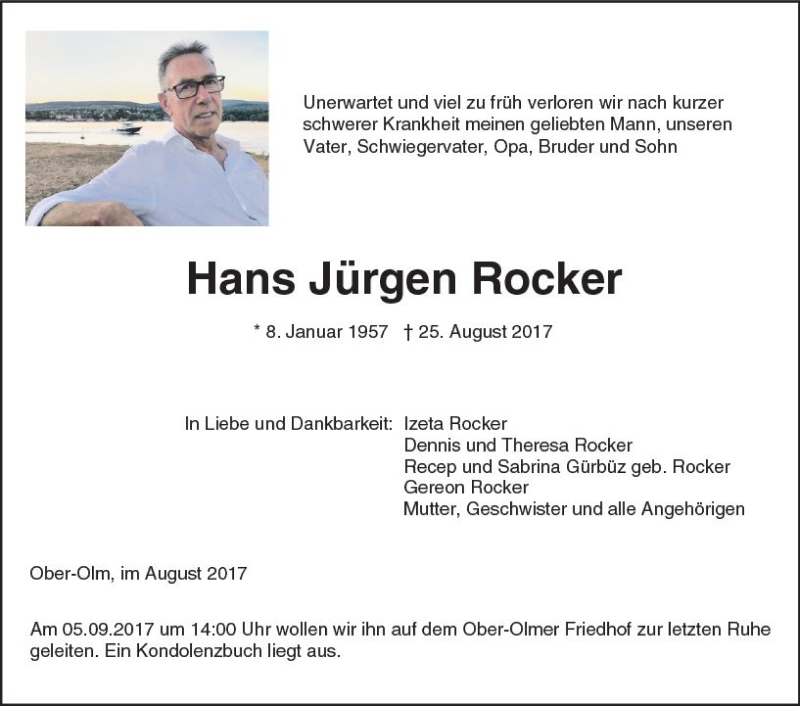 Hier finden Sie alle Traueranzeigen aus der Zeitung, die bisher für Hans Jürgen Rocker erschienen sind. Weitere Traueranzeigen, die in der Zeitung erscheinen, werden hier ebenfalls aufgelistet