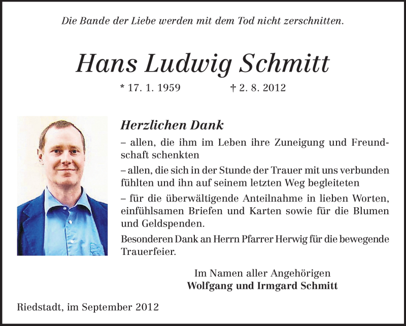 Hier finden Sie alle Traueranzeigen aus der Zeitung, die bisher für Hans Ludwig Schmitt erschienen sind. Weitere Traueranzeigen, die in der Zeitung erscheinen, werden hier ebenfalls aufgelistet