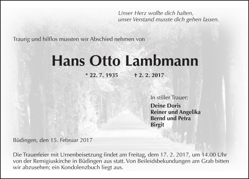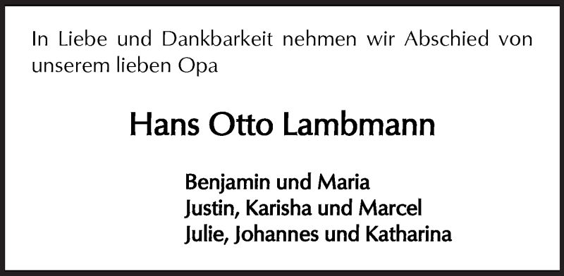 Hier finden Sie alle Traueranzeigen aus der Zeitung, die bisher für Hans Otto Lambmann erschienen sind. Weitere Traueranzeigen, die in der Zeitung erscheinen, werden hier ebenfalls aufgelistet