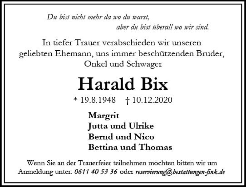 Hier finden Sie alle Traueranzeigen aus der Zeitung, die bisher für Harald Bix erschienen sind. Weitere Traueranzeigen, die in der Zeitung erscheinen, werden hier ebenfalls aufgelistet
