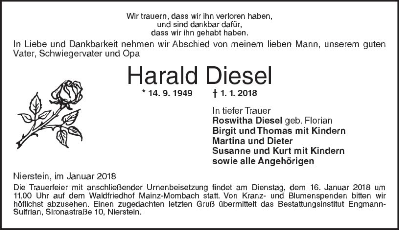Hier finden Sie alle Traueranzeigen aus der Zeitung, die bisher für Harald Diesel erschienen sind. Weitere Traueranzeigen, die in der Zeitung erscheinen, werden hier ebenfalls aufgelistet