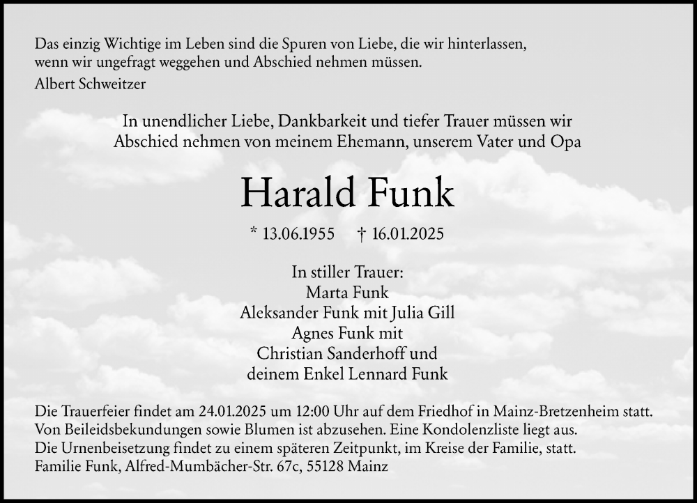 Hier finden Sie alle Traueranzeigen aus der Zeitung, die bisher für Harald Funk erschienen sind. Weitere Traueranzeigen, die in der Zeitung erscheinen, werden hier ebenfalls aufgelistet