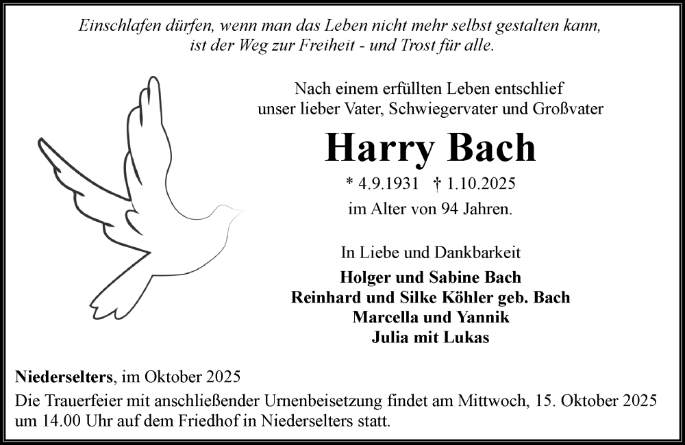 Hier finden Sie alle Traueranzeigen aus der Zeitung, die bisher für Harry Bach erschienen sind. Weitere Traueranzeigen, die in der Zeitung erscheinen, werden hier ebenfalls aufgelistet