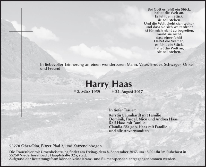 Hier finden Sie alle Traueranzeigen aus der Zeitung, die bisher für Harry Haas erschienen sind. Weitere Traueranzeigen, die in der Zeitung erscheinen, werden hier ebenfalls aufgelistet