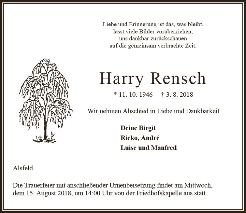 Hier finden Sie alle Traueranzeigen aus der Zeitung, die bisher für Harry Rensch erschienen sind. Weitere Traueranzeigen, die in der Zeitung erscheinen, werden hier ebenfalls aufgelistet