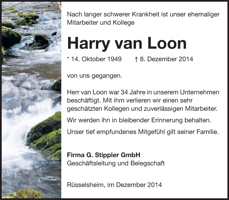 Hier finden Sie alle Traueranzeigen aus der Zeitung, die bisher für Harry van Loon erschienen sind. Weitere Traueranzeigen, die in der Zeitung erscheinen, werden hier ebenfalls aufgelistet