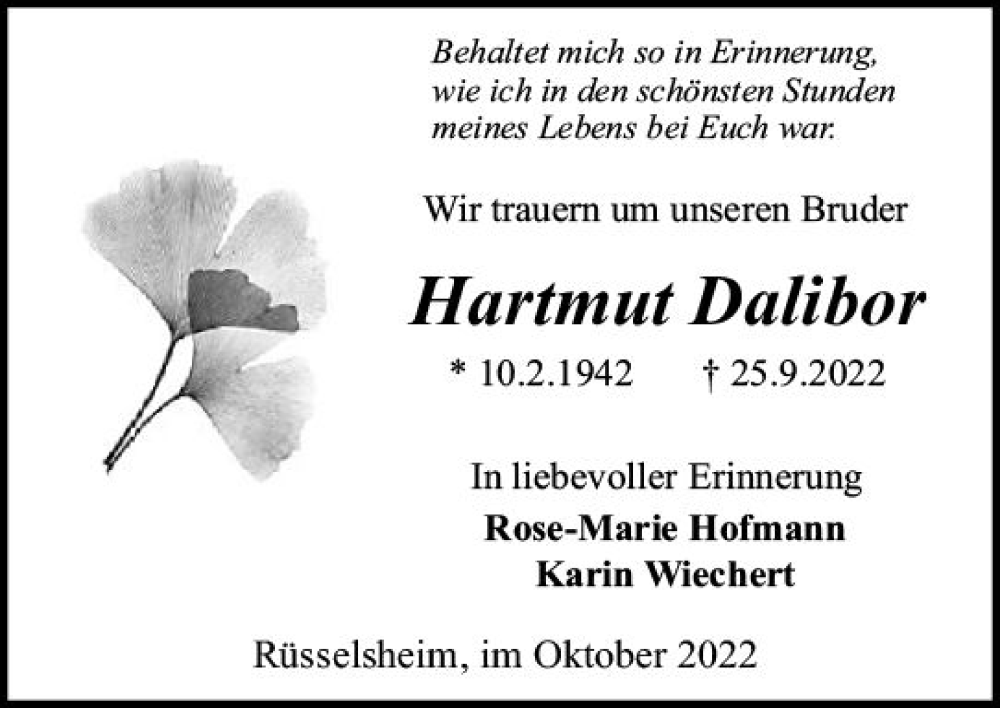 Hier finden Sie alle Traueranzeigen aus der Zeitung, die bisher für Hartmut Dalibor erschienen sind. Weitere Traueranzeigen, die in der Zeitung erscheinen, werden hier ebenfalls aufgelistet