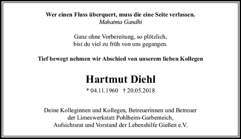Hier finden Sie alle Traueranzeigen aus der Zeitung, die bisher für Hartmut Diehl erschienen sind. Weitere Traueranzeigen, die in der Zeitung erscheinen, werden hier ebenfalls aufgelistet