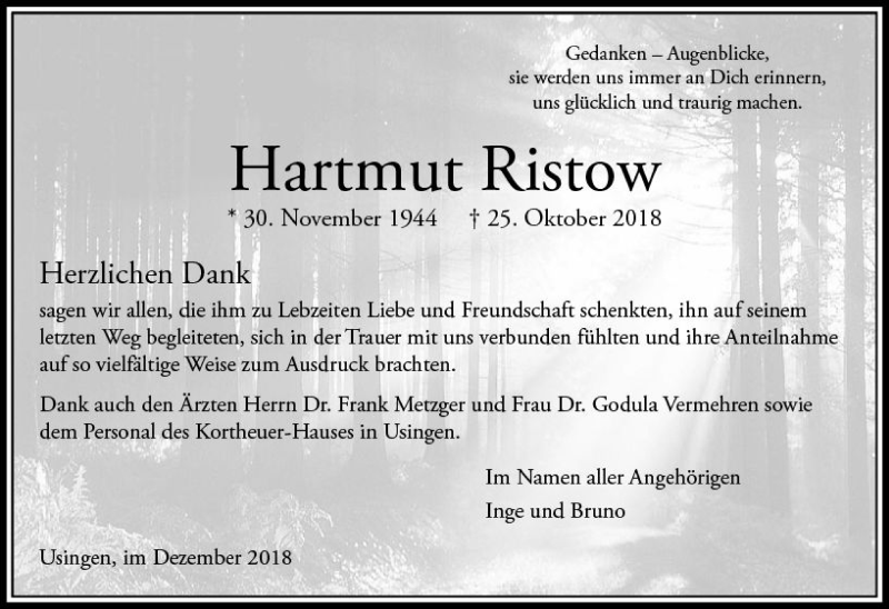 Hier finden Sie alle Traueranzeigen aus der Zeitung, die bisher für Hartmut Ristow erschienen sind. Weitere Traueranzeigen, die in der Zeitung erscheinen, werden hier ebenfalls aufgelistet