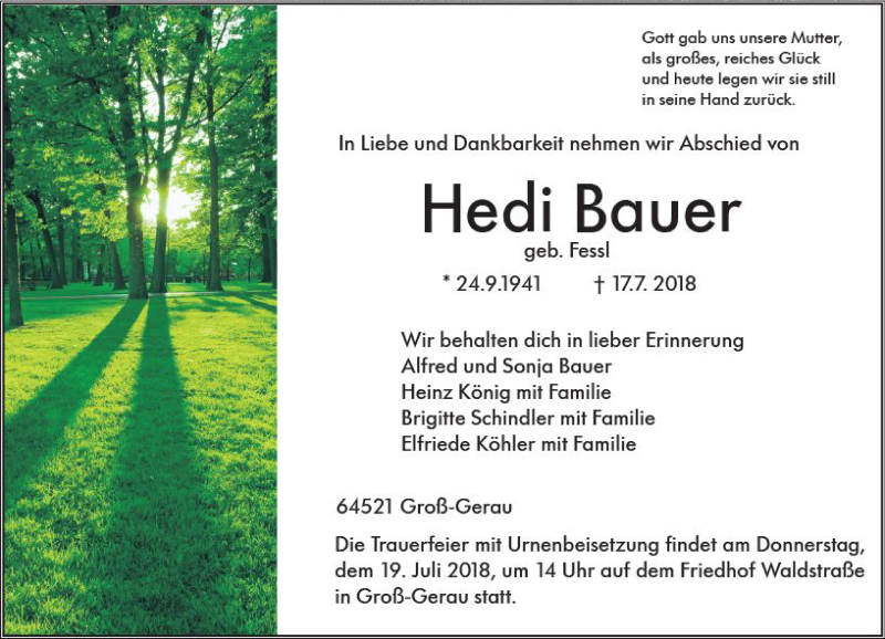 Hier finden Sie alle Traueranzeigen aus der Zeitung, die bisher für Hedi Bauer erschienen sind. Weitere Traueranzeigen, die in der Zeitung erscheinen, werden hier ebenfalls aufgelistet