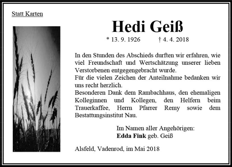 Hier finden Sie alle Traueranzeigen aus der Zeitung, die bisher für Hedi Geiß erschienen sind. Weitere Traueranzeigen, die in der Zeitung erscheinen, werden hier ebenfalls aufgelistet