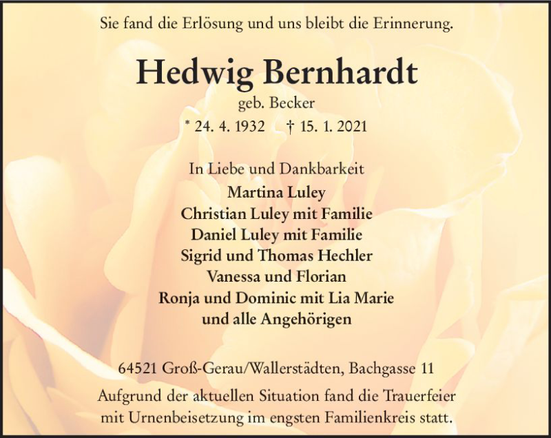 Hier finden Sie alle Traueranzeigen aus der Zeitung, die bisher für Hedwig Bernhardt erschienen sind. Weitere Traueranzeigen, die in der Zeitung erscheinen, werden hier ebenfalls aufgelistet