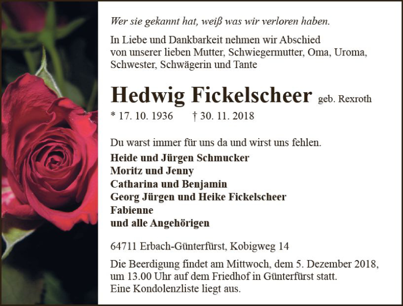 Hier finden Sie alle Traueranzeigen aus der Zeitung, die bisher für Hedwig Fickelscheer erschienen sind. Weitere Traueranzeigen, die in der Zeitung erscheinen, werden hier ebenfalls aufgelistet