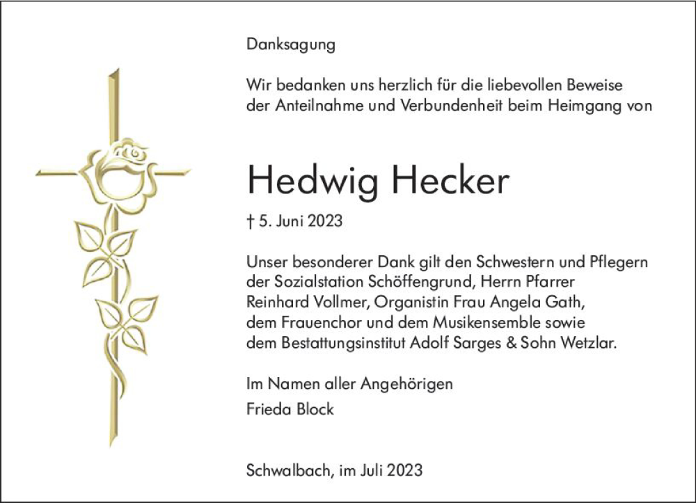 Hier finden Sie alle Traueranzeigen aus der Zeitung, die bisher für Hedwig Hecker erschienen sind. Weitere Traueranzeigen, die in der Zeitung erscheinen, werden hier ebenfalls aufgelistet