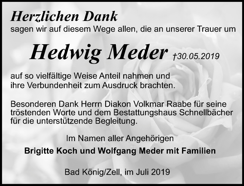 Hier finden Sie alle Traueranzeigen aus der Zeitung, die bisher für Hedwig Meder erschienen sind. Weitere Traueranzeigen, die in der Zeitung erscheinen, werden hier ebenfalls aufgelistet