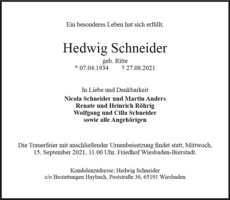 Hier finden Sie alle Traueranzeigen aus der Zeitung, die bisher für Hedwig Schneider erschienen sind. Weitere Traueranzeigen, die in der Zeitung erscheinen, werden hier ebenfalls aufgelistet