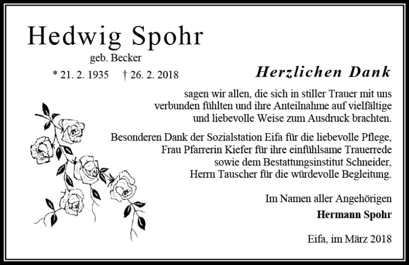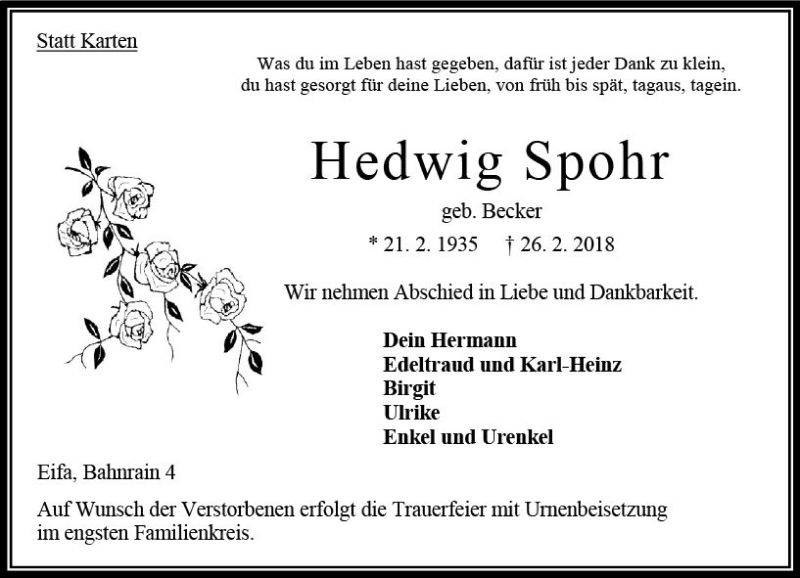 Hier finden Sie alle Traueranzeigen aus der Zeitung, die bisher für Hedwig Spohr erschienen sind. Weitere Traueranzeigen, die in der Zeitung erscheinen, werden hier ebenfalls aufgelistet