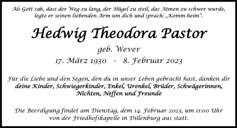 Hier finden Sie alle Traueranzeigen aus der Zeitung, die bisher für Hedwig Theodora Pastor erschienen sind. Weitere Traueranzeigen, die in der Zeitung erscheinen, werden hier ebenfalls aufgelistet