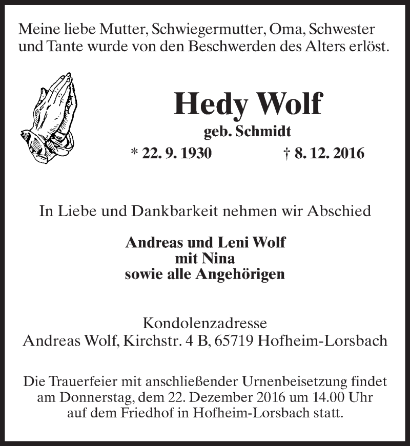 Hier finden Sie alle Traueranzeigen aus der Zeitung, die bisher für Hedy Wolf erschienen sind. Weitere Traueranzeigen, die in der Zeitung erscheinen, werden hier ebenfalls aufgelistet