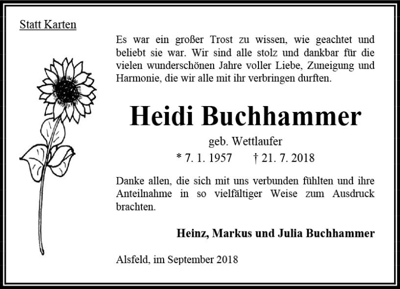 Hier finden Sie alle Traueranzeigen aus der Zeitung, die bisher für Heidi Buchhammer erschienen sind. Weitere Traueranzeigen, die in der Zeitung erscheinen, werden hier ebenfalls aufgelistet