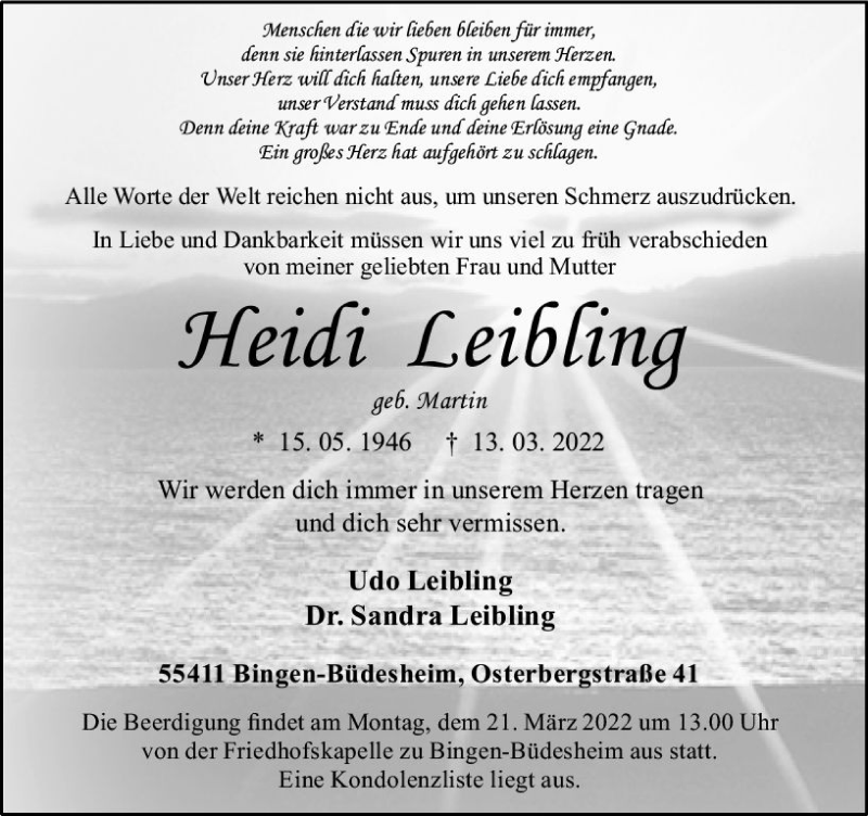 Hier finden Sie alle Traueranzeigen aus der Zeitung, die bisher für Heidi Leibling erschienen sind. Weitere Traueranzeigen, die in der Zeitung erscheinen, werden hier ebenfalls aufgelistet