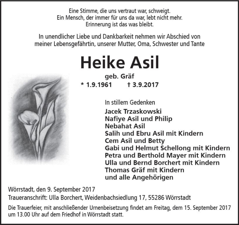 Hier finden Sie alle Traueranzeigen aus der Zeitung, die bisher für Heike Asil erschienen sind. Weitere Traueranzeigen, die in der Zeitung erscheinen, werden hier ebenfalls aufgelistet