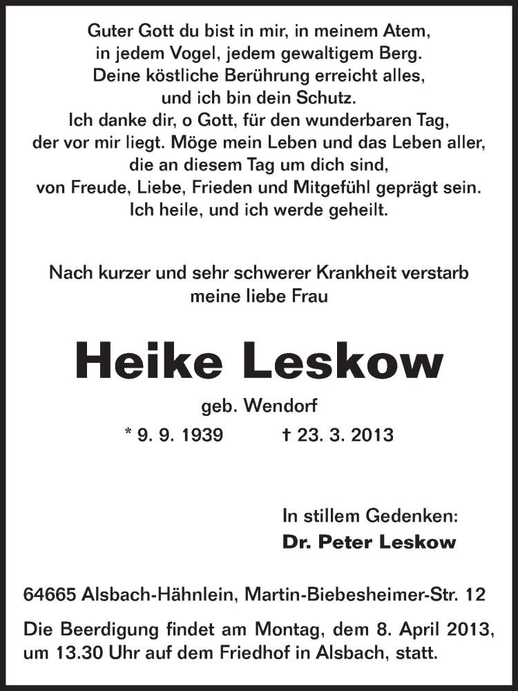 Hier finden Sie alle Traueranzeigen aus der Zeitung, die bisher für Heike Leskow erschienen sind. Weitere Traueranzeigen, die in der Zeitung erscheinen, werden hier ebenfalls aufgelistet