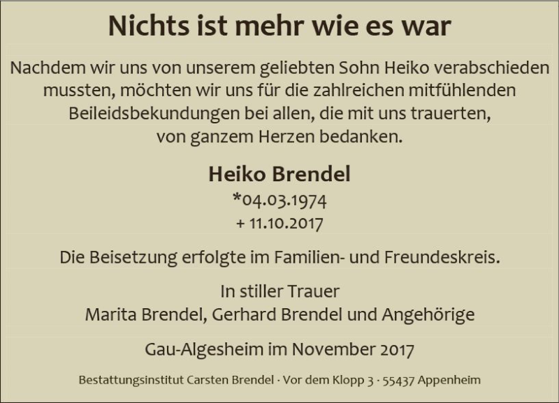 Hier finden Sie alle Traueranzeigen aus der Zeitung, die bisher für Heiko Brendel erschienen sind. Weitere Traueranzeigen, die in der Zeitung erscheinen, werden hier ebenfalls aufgelistet