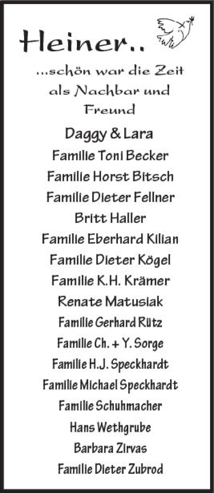 Hier finden Sie alle Traueranzeigen aus der Zeitung, die bisher für Heiner erschienen sind. Weitere Traueranzeigen, die in der Zeitung erscheinen, werden hier ebenfalls aufgelistet