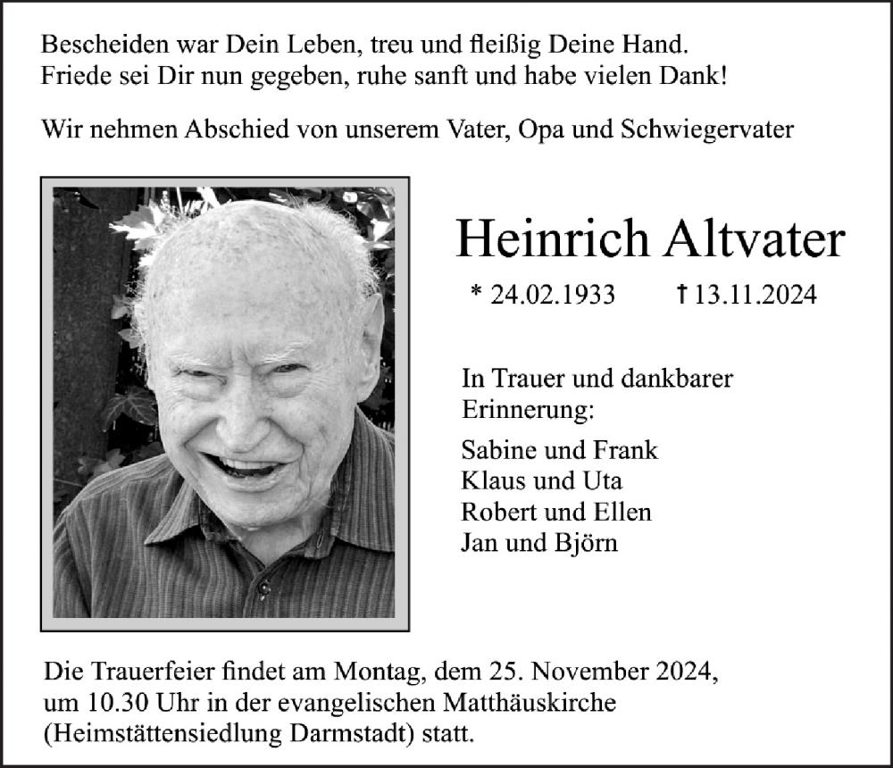 Hier finden Sie alle Traueranzeigen aus der Zeitung, die bisher für Heinrich Altvater erschienen sind. Weitere Traueranzeigen, die in der Zeitung erscheinen, werden hier ebenfalls aufgelistet