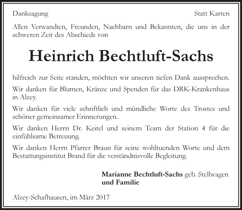 Hier finden Sie alle Traueranzeigen aus der Zeitung, die bisher für Heinrich Bechtluft-Sachs erschienen sind. Weitere Traueranzeigen, die in der Zeitung erscheinen, werden hier ebenfalls aufgelistet