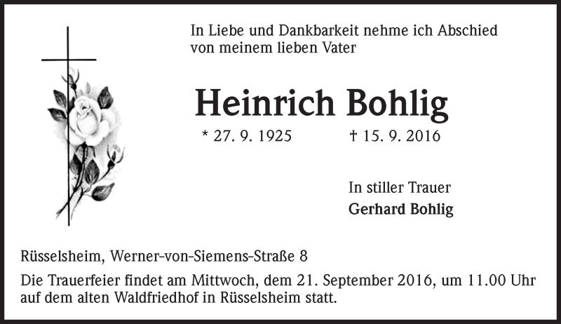 Hier finden Sie alle Traueranzeigen aus der Zeitung, die bisher für Heinrich Bohlig erschienen sind. Weitere Traueranzeigen, die in der Zeitung erscheinen, werden hier ebenfalls aufgelistet