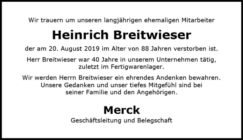 Hier finden Sie alle Traueranzeigen aus der Zeitung, die bisher für Heinrich Breitwieser erschienen sind. Weitere Traueranzeigen, die in der Zeitung erscheinen, werden hier ebenfalls aufgelistet