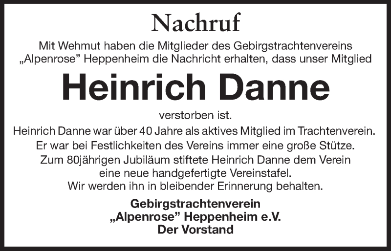 Hier finden Sie alle Traueranzeigen aus der Zeitung, die bisher für Heinrich Danne erschienen sind. Weitere Traueranzeigen, die in der Zeitung erscheinen, werden hier ebenfalls aufgelistet