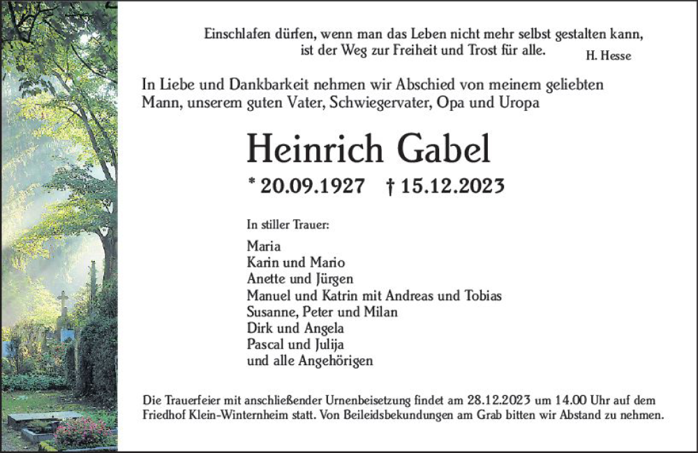 Hier finden Sie alle Traueranzeigen aus der Zeitung, die bisher für Heinrich Gabel erschienen sind. Weitere Traueranzeigen, die in der Zeitung erscheinen, werden hier ebenfalls aufgelistet