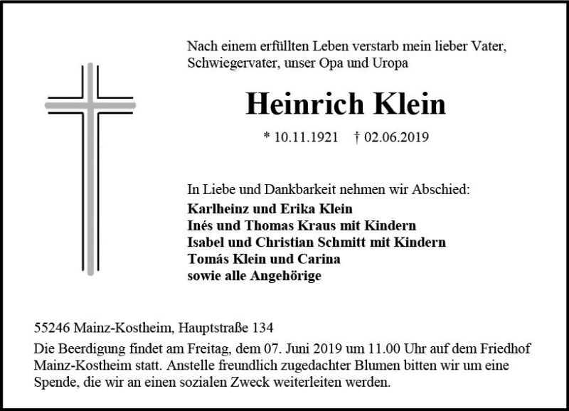 Hier finden Sie alle Traueranzeigen aus der Zeitung, die bisher für Heinrich Klein erschienen sind. Weitere Traueranzeigen, die in der Zeitung erscheinen, werden hier ebenfalls aufgelistet