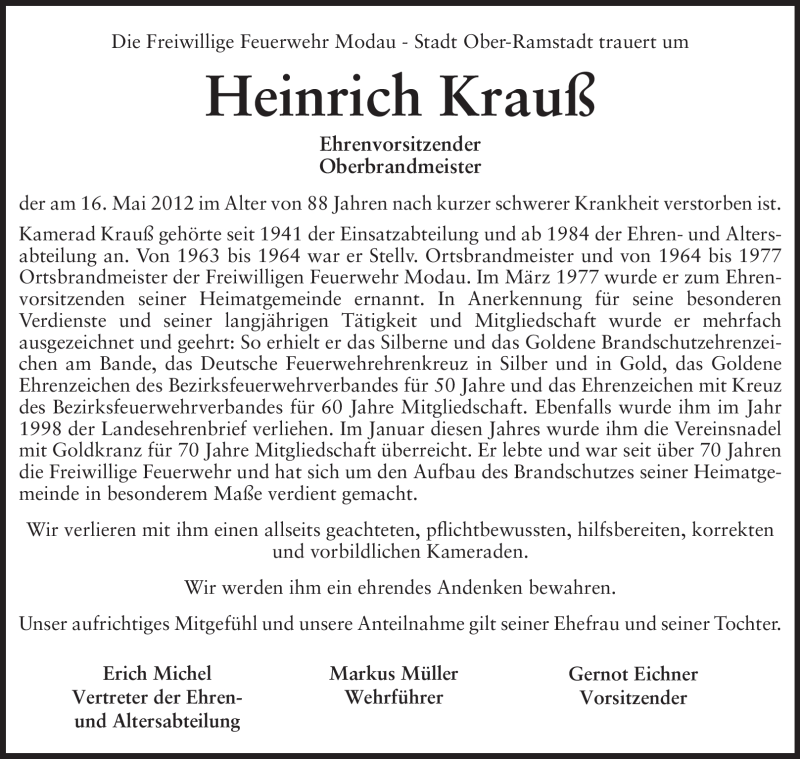 Hier finden Sie alle Traueranzeigen aus der Zeitung, die bisher für Heinrich Krauß erschienen sind. Weitere Traueranzeigen, die in der Zeitung erscheinen, werden hier ebenfalls aufgelistet